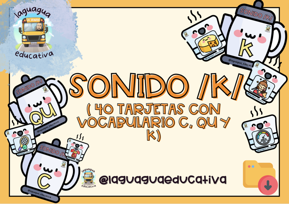 Recurso manipulativo para trabajar el sonido /k/. El recurso consta de 40 tarjetas, con palabras que contienen las sílabas ca, que, qui, co y cu. Aparte de colocar la taza en su correspondiente cafetera, también hemos trabajado la creación de frases con ese vocabulario.